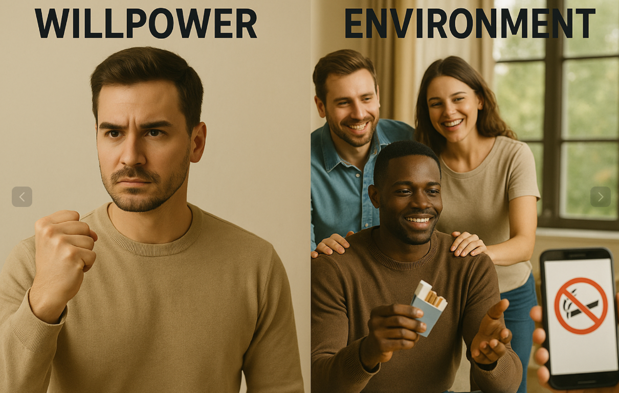 However, willpower has its limits. In high-stress periods, or when fatigue or unexpected life events occur, it weakens easily. It is precisely in such moments that environment plays a stronger role. For example, if you are surrounded by smokers or constantly exposed to smoking areas (break rooms, outdoor smoking spots, etc.), even strong willpower can struggle against frequent temptation.